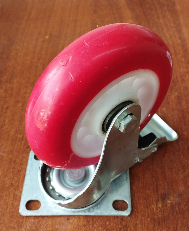 Ролик, колесико, колесо поворотное диаметром 120 мм на металлической платформе с подшипником и тормозом. Применяется в быту и на различном техническом оборудовании, а также используется как ролик к офисной корпусной мебели, столам, тумбам, различным площадкам. Материалы, из которых изготовлено колесо, соответствуют строгим нормам безопасности и экологичности. Покрытие из композитных материалов гарантирует износостойкость изделия и позволяет ему сохранять декоративные и ресурсные свойства в течение долгого периода времени. Покрытие ролика не оставляет следы на покрытиях, что позволяет использовать его на кафеле, линолеуме, паркете. Допустимая нагрузка до 160 кг.